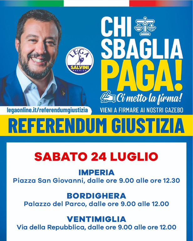 Domani, sabato 24 Luglio, riprende in provincia di Imperia la raccolta firme per la campagna referendaria sulla Giustizia che la Lega ha deciso di promuovere insieme al Partito Radicale e che ha già superato le 300.000 sottoscrizioni.