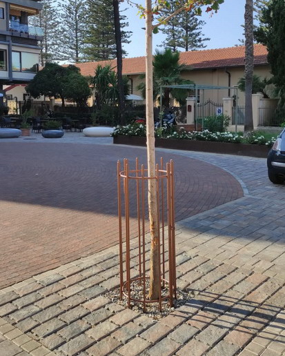 Eccole le protezioni installate a difesa degli alberi di ‘Ginkgo Biloba’ che sorgono al centro della nuova Piazza della Stazione sulla zona pedonale costeggiata dai posteggi.