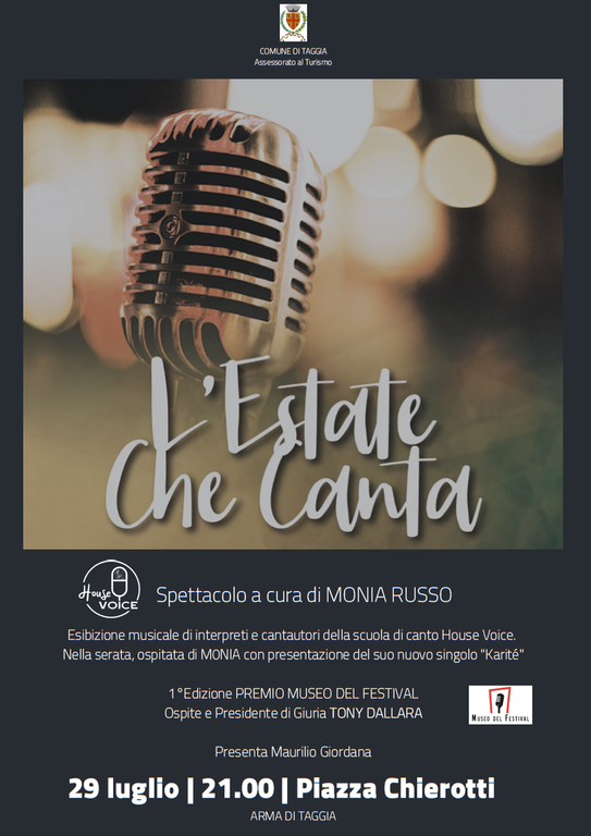 Il Museo del Festival, curato da Marco Canova, ha istituito il primo premio di una serata speciale che si terrà ad Arma di Taggia questa sera alle 21 in Piazza Chierotti, 'L'estate che Canta', esibizione musicale di interpreti e cantautori della scuola di canto House Voice di Monia Russo.
