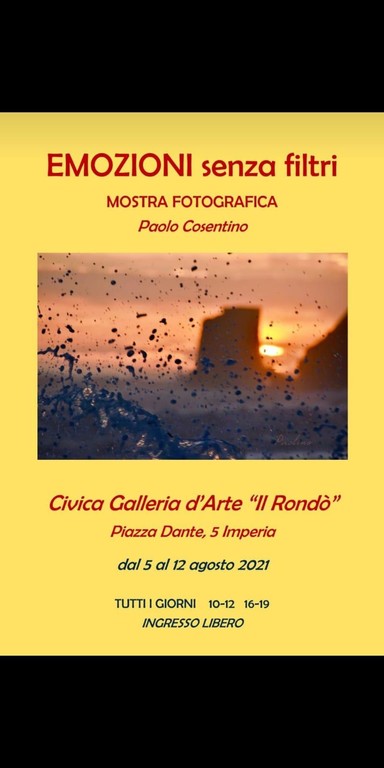 Da oggi sino al 12 agosto, presso la Civica Galleria d'Arte "Il Rondò" di Imperia, si terrà la mostra fotografica personale di Paolo Cosentino, Paolino, intitolata "Emozioni senza filtri".