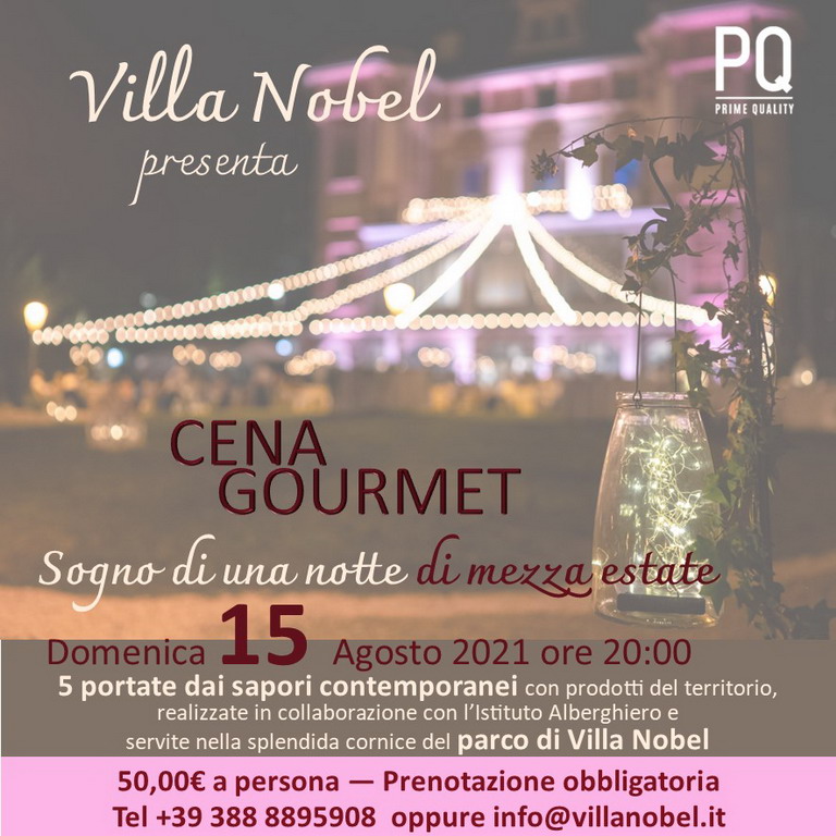 Cena Degustazione Gourmet. Cinque portate dai sapori contemporanei con prodotti del territorio, realizzate in collaborazione con l’Istituto Alberghiero e servite nella splendida cornice del parco di Villa Nobel.