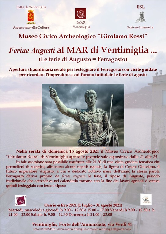 Nella serata di domenica 15 agosto il Museo Civico Archeologico “Girolamo Rossi” di Ventimiglia aprirà le proprie sale espositive dalle 21 alle 23. In tale occasione sarà possibile usufruire, alle 21.30, di una visita guidata tematica che permetterà di scoprire, attraverso alcuni reperti esposti, la figura di Cesare Ottaviano, il futuro imperatore Augusto, a cui è dedicato l'ottavo mese dell'anno: la stessa parola Ferragosto deriva proprio da feriae augusti, le ferie, il riposo di Augusto, periodo tradizionale che coincideva nel calendario romano con la fine dei lavori agricoli e veniva quindi festeggiato con feste e riposo.