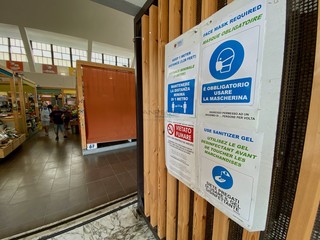 All’ingresso del Mercato Annonario c’è un cartello molto chiaro: la mascherina è obbligatoria, così come è obbligatorio mantenere la distanza interpersonale. All’interno del Mercato Annonario, però, la realtà è ben diversa.
