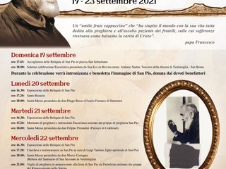 Mercoledì 22 esposizione alle 16.30 seguita dalla catechesi e testimonianza su San Pio a cura di Luigi Taurino, figlio spirituale di San Pio. Alle 18 la Messa presieduta da don Marco Castagna, rettore del santuario di San Secondo a Ventimiglia. Alle 21, infine, la veglia di preghiera in preparazione alla festa di San Pio da Pietralcina dai gruppi del Rinnovamento dello Spirito.