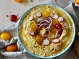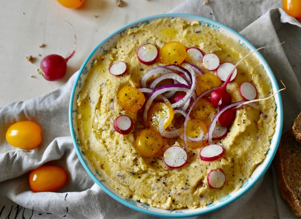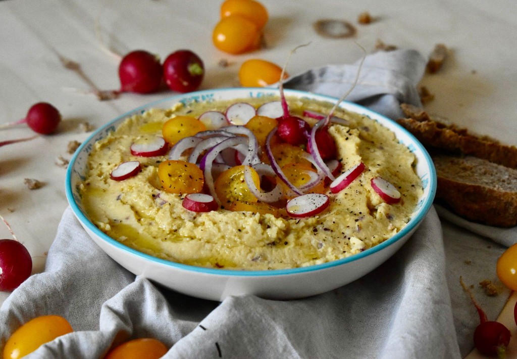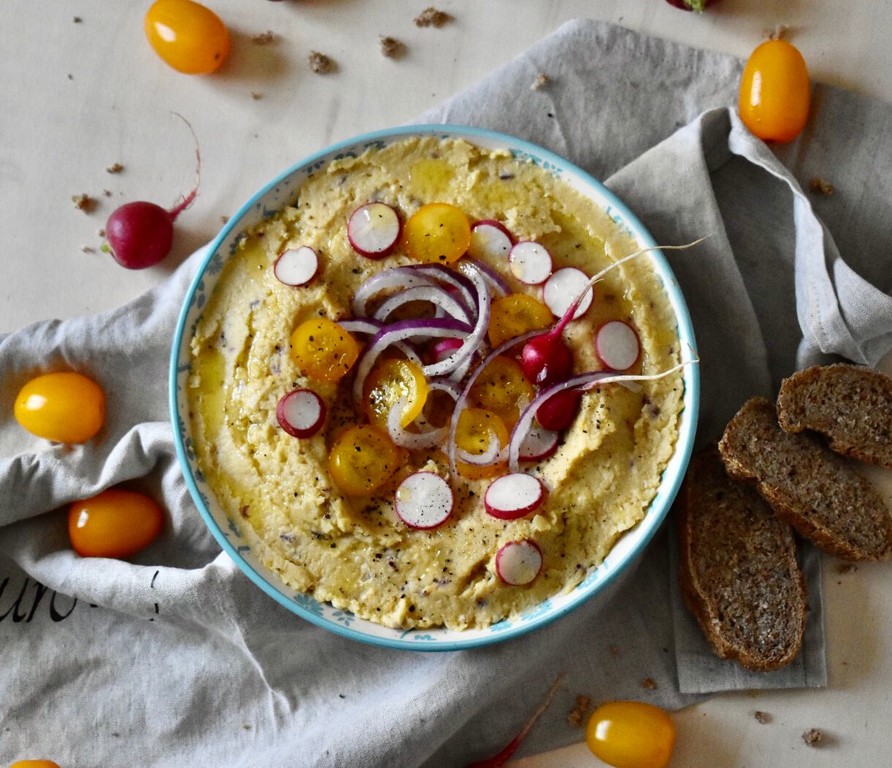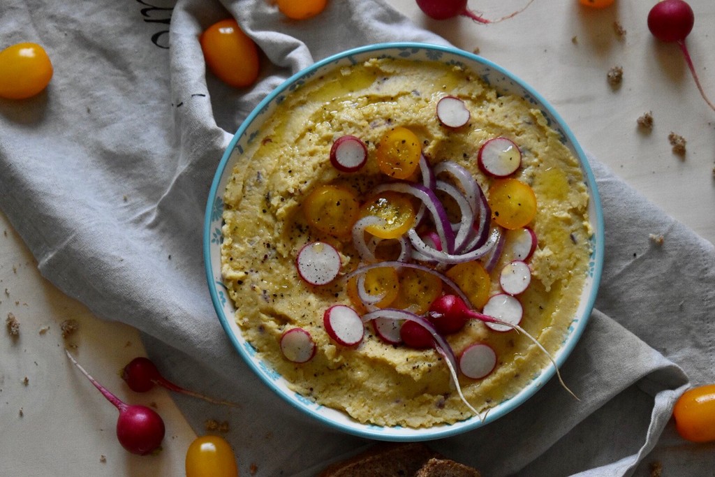 Tagliate degli anelli di cipolla, dei pomodorini, dei ravanelli o altre verdure fresche che avete a disposizione e guarnite il vostro hummus. Finirete con un giro d'olio, una spolverata di sale e di pepe. Ora è pronto per essere spalmato su delle fette di buon pane, che può benissimo essere quello del giorno prima. Ricordate che le nostre sono tutte ricette anti spreco.
