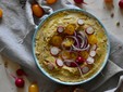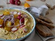 Consiglio di presentarlo con delle verdure colorate e di diversa consistenza: ad esempio anche con del radicchio abbinato a dei pomodorini, un'accoppiata che conferirà un interessante gioco di sapori.