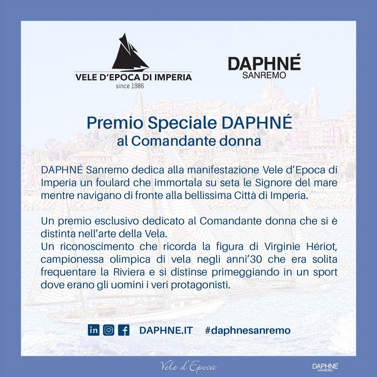 Un premio esclusivo dedicato al Comandante donna che si è distinta nell’arte della Vela. Un riconoscimento che ricorda la figura di Virginie Hériot, campionessa olimpica di vela negli anni’30 che era solita frequentare la Riviera e si distinse primeggiando in uno sport dove erano gli uomini i veri protagonisti.