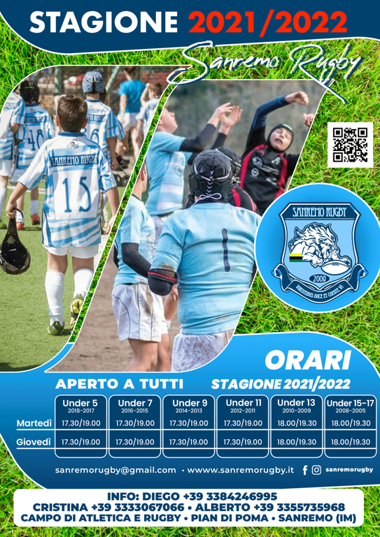Per maggiori informazioni è possibile telefonare al numero 338 4246995 (Diego), 333 3067066 (Cristina), 335 5735968 (Alberto) o visitare il sito www.sanremorugby.it e i canali social di Facebook e Instagram.