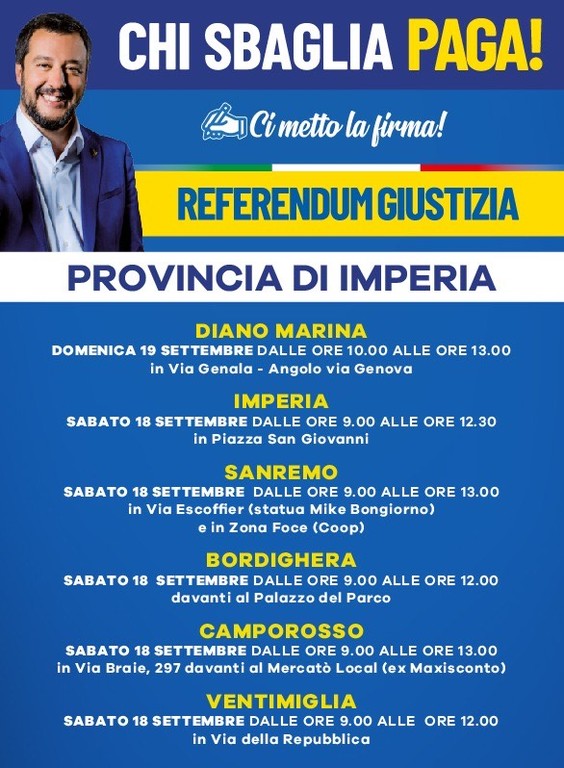 Domani, sabato 18 settembre, riprende in provincia di Imperia la raccolta firme per la campagna referendaria sulla Giustizia che la Lega ha deciso di promuovere insieme al Partito Radicale, con l’obiettivo di superare abbondantemente le 500.000 firme necessarie per l’indizione dei referendum.