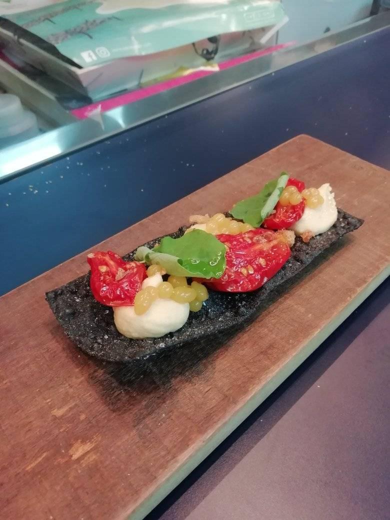In questa occasione lo chef Luca Andrè ha creato con I fiori una bruschetta con pasta di semola e carbone vegetale e poi fritta con una crema di ceci e burro di canapa e farcita con caviale di pomodoro rosso con aggiunta di cipolla croccante e olio aromatizzato alle foglie e fiori di nasturzio.