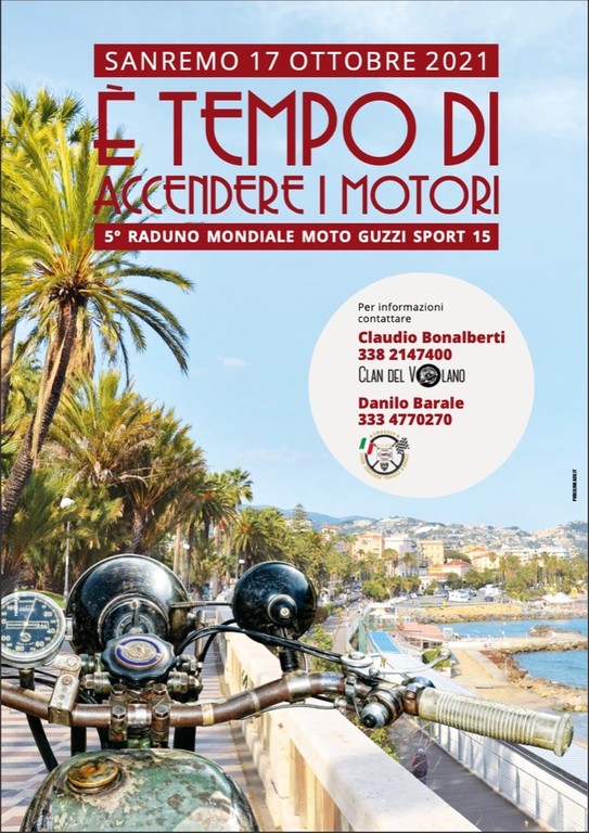Per celebrare i 100 anni della moto Guzzi (1921-2021) il Club del Volano e il Cave hanno organizzato un raduno a Sanremo il 17 ottobre. Ad oggi è prevista la partecipazione di poco meno di un centinaio di esemplari dell'iconica moto italiana, almeno 70 sport 15. Sarà un vero e proprio carosello dedicato alla Guzzi, con modelli di tutti i tipi e di tutti gli anni che si uniranno per fare un giro fino a Ospedaletti.