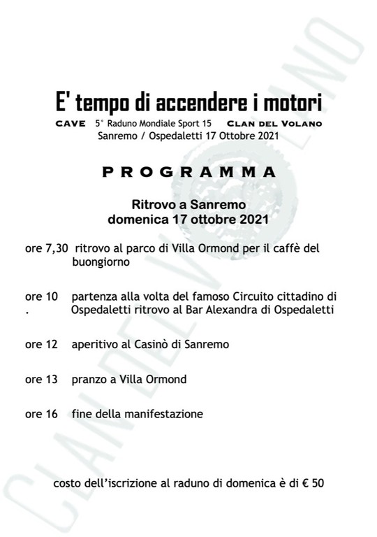 Il ritrovo per l’evento di domenica 17 è al Parco di Villa Ormond per il caffè di benvenuto. Alle 10 la partenza dei partecipanti alla volta del Circuito di Ospedaletti; alle 12 aperitivo al Casinò di Sanremo; alle 13 il pranzo a Villa Ormod e alle 16 il termine della manifestazione.