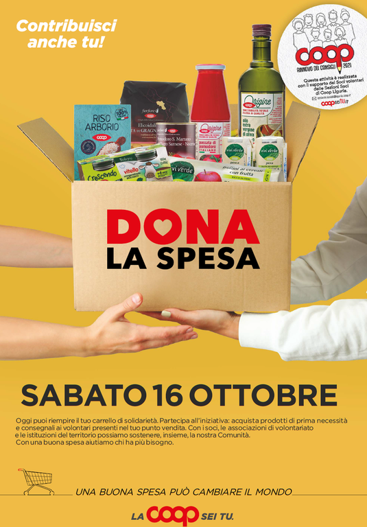 Sabato 16 ottobre torna la raccolta solidale “Dona la spesa”, organizzata da Coop Liguria per sostenere le associazioni del volontariato impegnate nella lotta alla povertà.