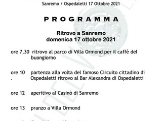 Il ritrovo per l’evento di domenica 17 è al Parco di Villa Ormond per il caffè di benvenuto. Alle 10 la partenza dei partecipanti alla volta del Circuito di Ospedaletti; alle 12 aperitivo al Casinò di Sanremo; alle 13 il pranzo a Villa Ormod e alle 16 il termine della manifestazione.