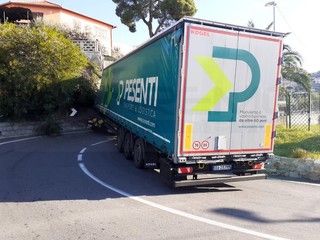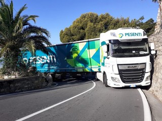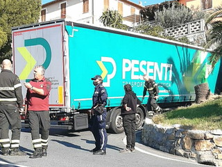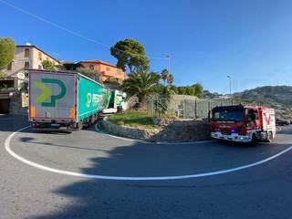 Un altro messo pesante bloccato tra le curve di via Val D’Olivi a Sanremo, la strada che unisce l’Aurelia in corso Mazzini con la frazione di Poggio.