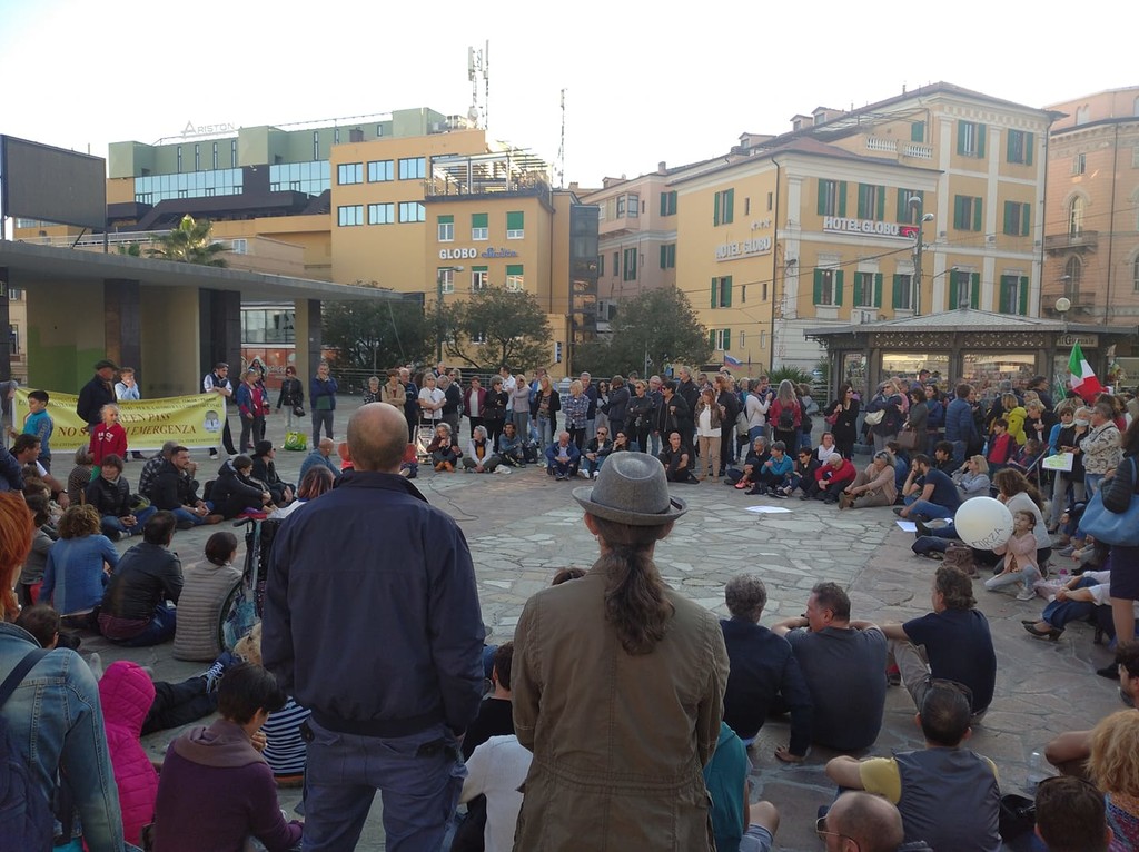 I militanti si sono riuniti in una sorta di catena umana, hanno intonato dei mantra e hanno ricordato anche il caso di Riccardo Ventre 18enne ricoverato d'urgenza nel reparto di Neurologia ad Imperia, 15 giorni dopo la prima dose di vaccino