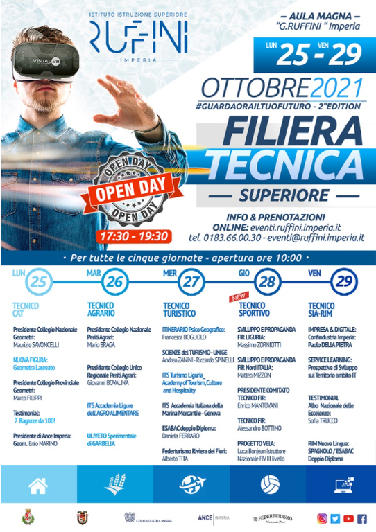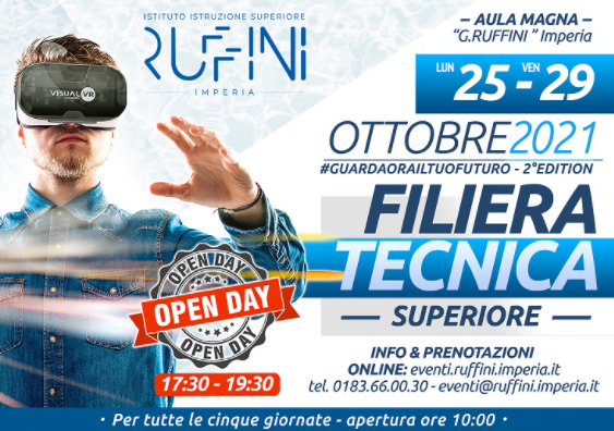 Nella settimana che l’Istituto Ruffini dedica agli ‘Open Day’ giovedì 28 ottobre sarà dedicato al nuovo corso ‘Tecnico sportivo’, si avvicenderanno nella mattinata il Tecnico Responsabile dello Sviluppo della Federazione Italiana Rugby Matteo Mizzon; Massimo Zorniotti Tecnico Responsabile per lo sviluppo della Regione Liguria per la Federazione Italiana Rugby e responsabile del progetto di collaborazione con l’IIS Ruffini; Il Presidente del Comitato Ligure Rugby Enrico Mantovani, il Presidente dell’Imperia Rugby ASD Luigi Ardoino, il Tecnico e atleta della Union Rugby Riviera Alessandro Ardoino, la fisioterapista e atleta della Union Rugby Riviera Alessandra Ravotto.