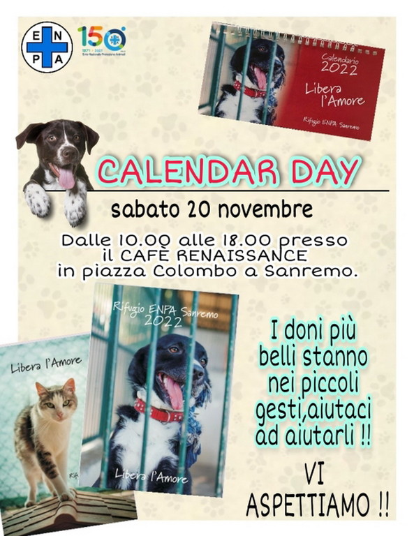 Sabato i volontari del Rifugio Enpa saranno in Piazza Colombo al Cafè Renaissance dalle ore 10,00 alle 18,00 con il banchetto con i calendari.