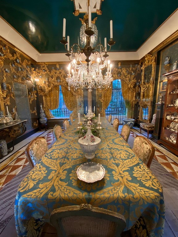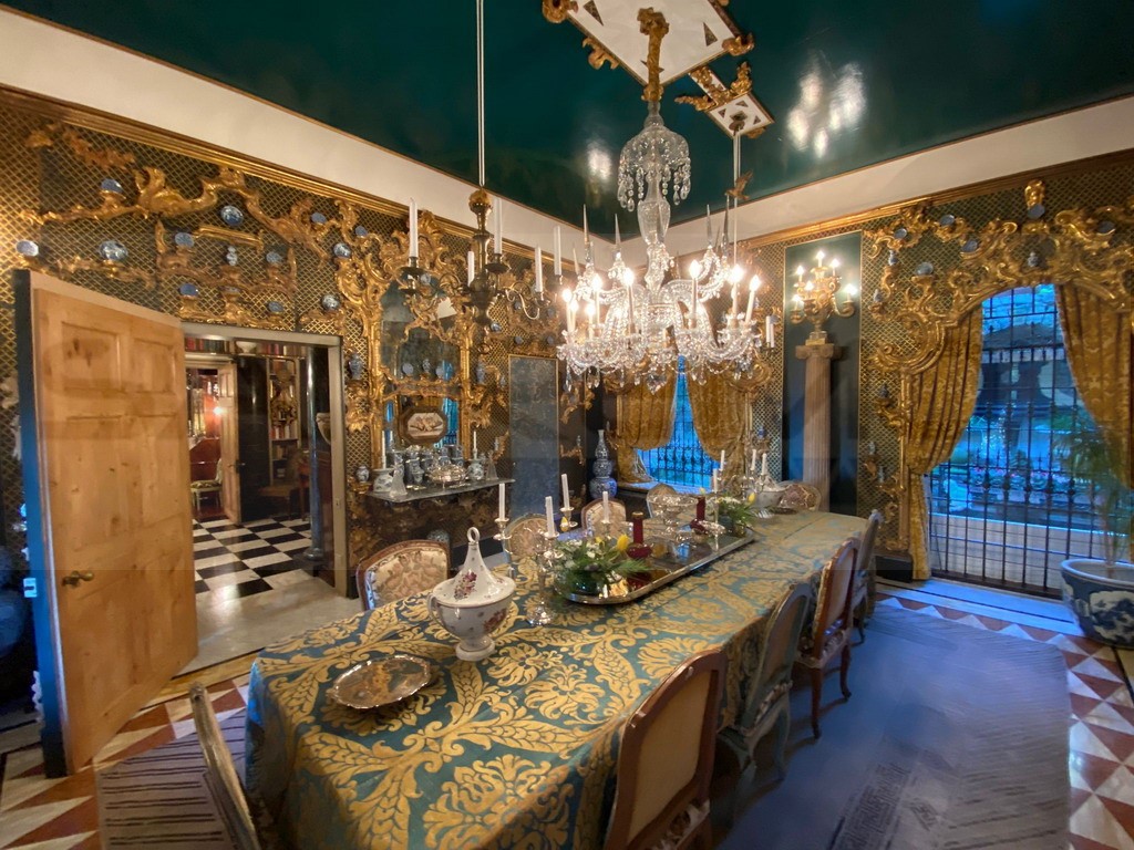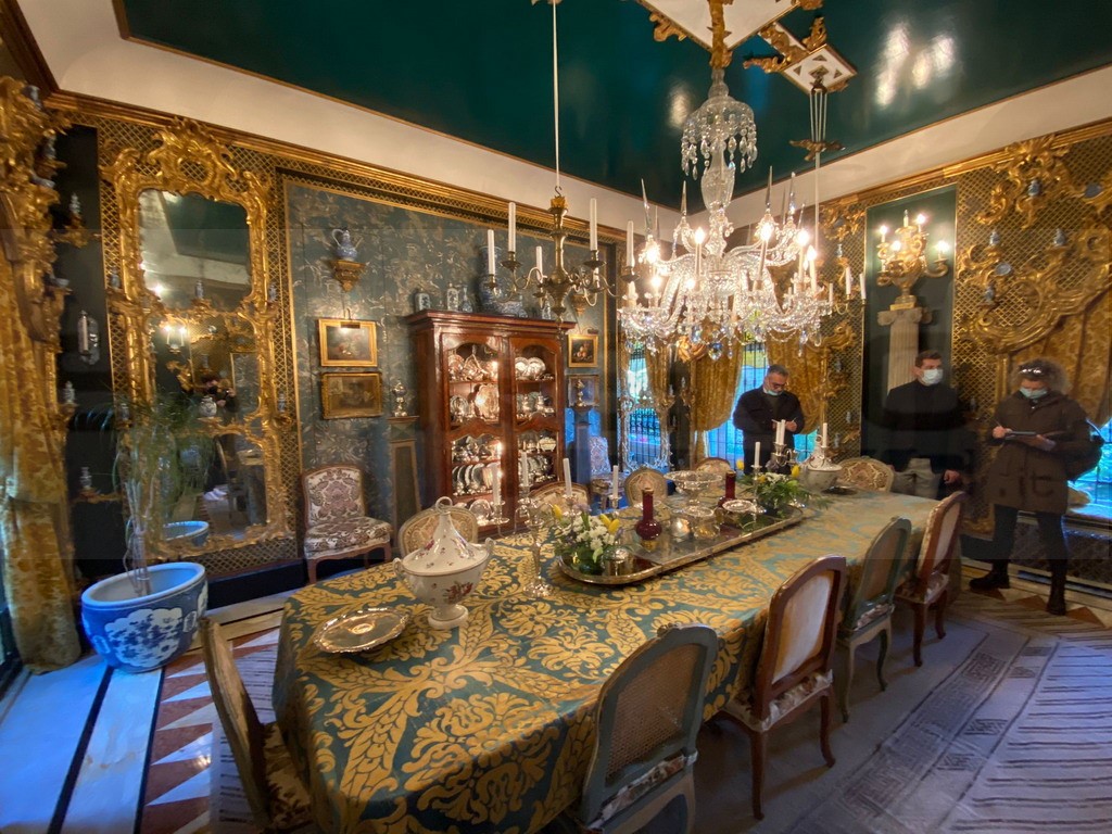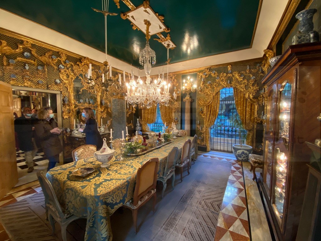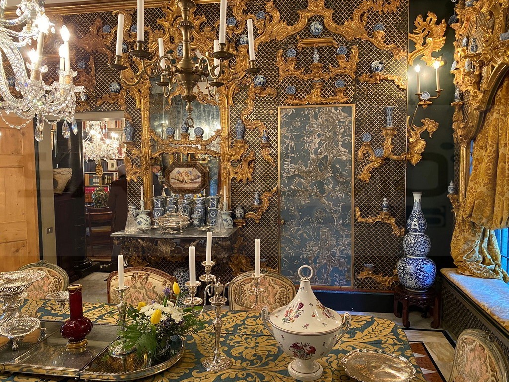 Curiosità e meraviglia suscitano gli allestimenti di alcune sale, progettati con creatività, sapienza e raffinato gusto da arredatore d’interno dallo stesso Luigi Anton Laura: nella sfavillante Sala da pranzo, ad esempio, le pareti sono decorate con parti di una splendida boiserie napoletana pienamente rococò, sulle cui mensoline poggiano piccole porcellane cinesi recuperate da un cargo mercantile cinese affondato verso il 1690 lungo le coste del Vietnam, oggetti sicuramente destinati al mercato olandese; e agli angoli della stessa sala, due monumentali vasi a “zucca” provenienti dalla più grande collezione di porcellane cinesi d’Europa, allestita a Dresda agli inizi del Settecento dal re Augusto II di Polonia.