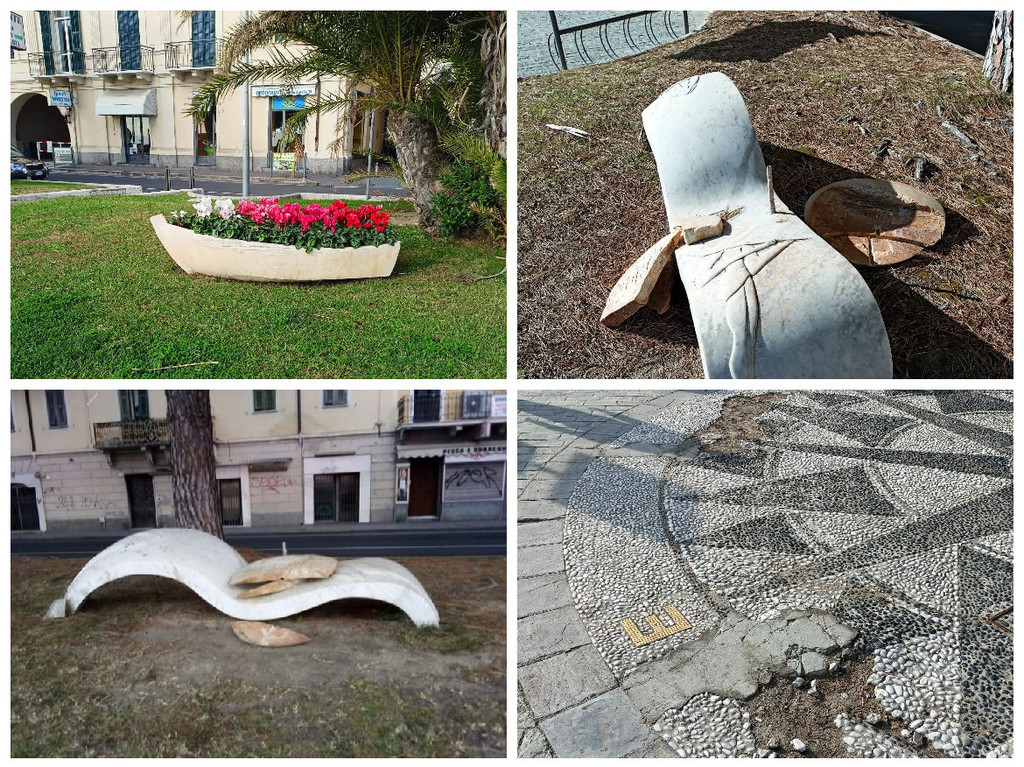 Diano Marina, incuria sulla passeggiata. La denuncia di Gramondo: “Comune inerme, opera d’arte usata come fioriera”