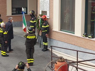 Alla presenza delle massime cariche istituzionali i pompieri imperiesi hanno svolto alcune esercitazioni ed è stata poi apposta una corona d’alloro alla targa con i nomi dei caduti.