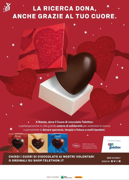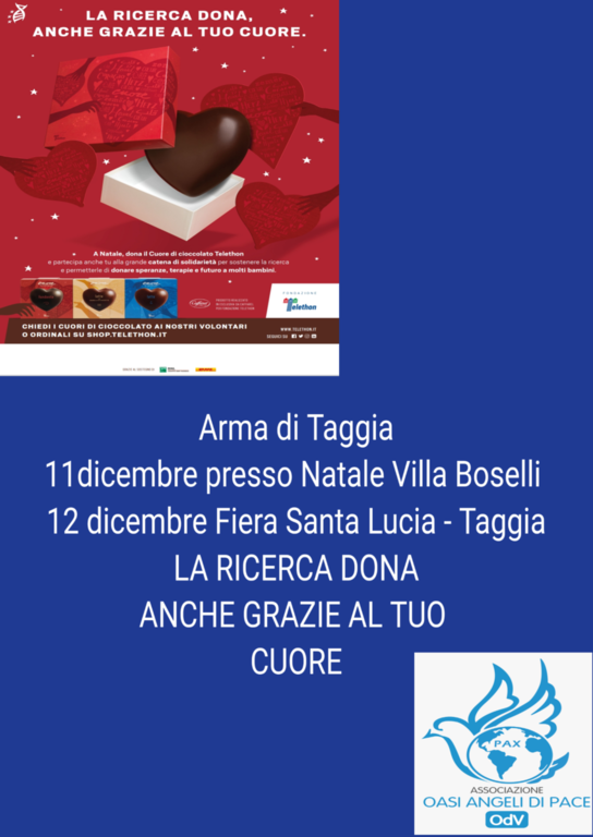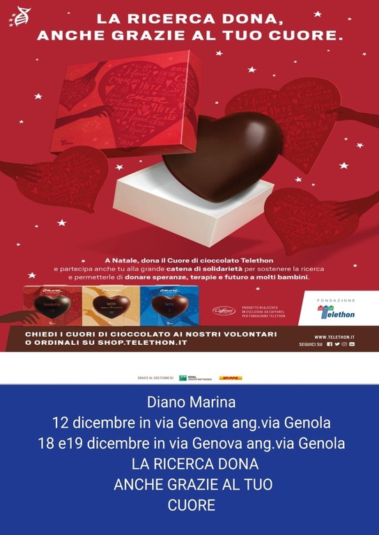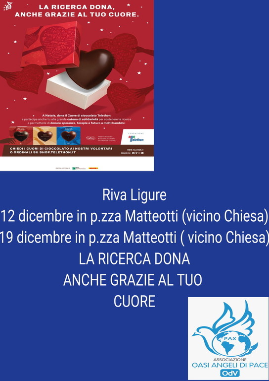 Anche quest’anno tornano nelle maggiori piazze d’Italia i banchetti e i classici Cuori di Cioccolato Telethon insieme a molti altri prodotti solidali che possono essere buone idee regalo per i doni di Natale. Per la provincia di Imperia sarà presente anche l'associazione Oasi Angeli di Pace OdV, uniti per la ricerca nelle seguenti città: Arma di Taggia 11 dicembre presso Villa Boselli; Taggia 12 dicembre Fiera di Santa Lucia; Riva Ligure 12 e 19 dicembre in piazza Matteotti; Diano Marina 11 dicembre via Genova; Diano Marina 18 e 19 dicembre via Genova.