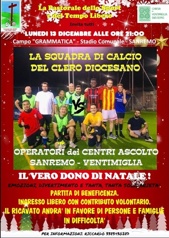 Lunedì 13 dicembre, alle 21, a Sanremo, presso il campo Grammatica dello Stadio Comunale partita di solidarietà per aiutare le famiglie bisognose. Una iniziativa nata dalla Pastorale dello Sport e del tempo Libero della Diocesi di Ventimiglia - Sanremo.