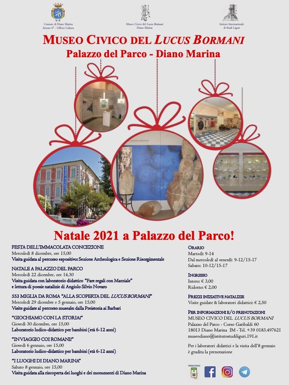 Si comincia con il doppio appuntamento nel pomeriggio di mercoledì 22 dicembre, in occasione dell’evento “Natale a Palazzo del Parco”, dove la Sezione Archeologica del Museo, a partire dalle ore 14:30, proporrà la visita guidata/laboratorio “Fare i regali con Marziale”: un percorso dove, accompagnati dalle parole del poeta Marziale, si scoprirà che tipo di doni si scambiavano i Romani nel periodo dei Saturnalia. Successivamente, a partire dalle ore 15.15, nella Sala Conferenze “Margherita Drago” della Biblioteca Civica, avrà luogo l’evento “Gli auguri di Novaro”, una pubblica lettura di poesie di natale del poeta Angiolo Sivlio Novaro a cura degli allievi dell'Istituto Comprensivo Statale di Diano Marina.