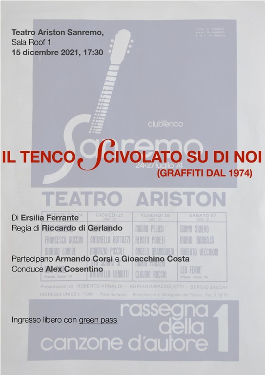 Mercoledì alle 17.30 presso la Sala Roof 1 del Teatro Ariston di Sanremo verrà proiettato in anteprima il video “Il Tenco scivolato su di noi (graffiti dal 1974)” di Ersilia Ferrante, regia di Riccardo Di Gerlando.
