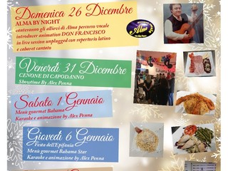 Domenica 26 dicembre “Alma by night”, serata con gli allievi di Alma percorso vocale e con l'animazione di Don Francisco, l'inventore del “Cantaestate” e titolare dello storico ristorante Mille Pini di San Romolo. Il rinomato artista si esibirà a inizio serata con un suo repertorio storico da cabaret.