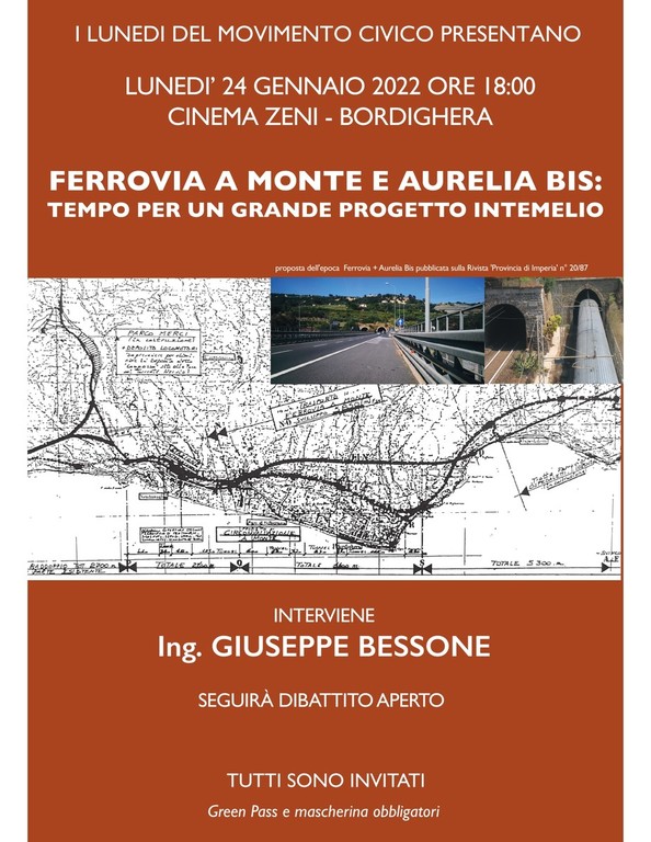 I lunedi del Movimento Civico ospiteranno lunedì 24 Gennaio alle ore 18:00 al Cinema Zeni la presentazione dell’ing. Giuseppe Bessone: “Ferrovia a monte e Aurelia bis – Tempo per un grande progetto intemelio”.