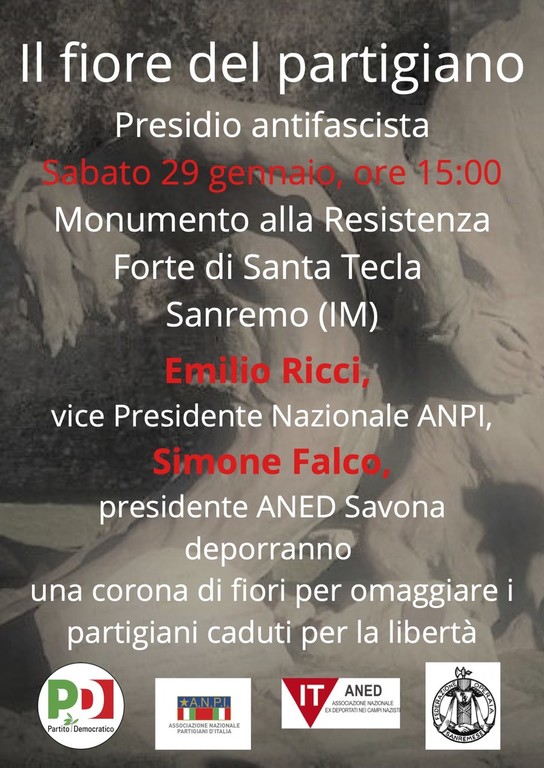 Sabato alle 15 è previsto un presidio antifascista presso il Forte di Santa Tecla. Emilio Ricci, vice presidente Nazionale ANPI, Simone Falco, presidente ANED Savona, Maurizio Caridi, Segretario cittadino del PD di Sanremo, Mario Parretta, Segretario del circolo PD di Sanremo, Giancarlo Di Remigio, Segretario del circolo PD di Coldirodi, e Claudio Vaniglia, Presidente della Federazione Operaia Sanremese, depositeranno un mazzo di fiori ai piedi del Monumento alla Resistenza per omaggiare i partigiani caduti per la libertà.