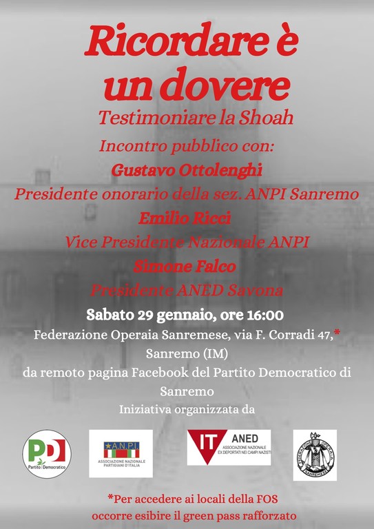 Il Partito Democratico di Sanremo ha organizzato due iniziative legate al Giorno della Memoria, realizzate in collaborazione con l’ANPI Sanremo e l’ANED Savona.