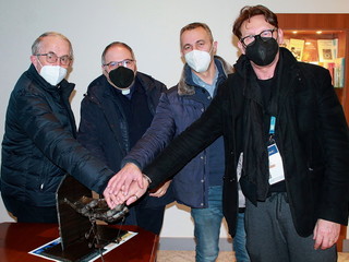 Tubo, lamiera, rondelle, sfere ed elettrodi per saldare: questi sono gli elementi con cui è stata forgiata l’opera in ferro che Diego Santamaria ha pensato per celebrare la 1^ edizione del Festival della Canzone Cristiana Sanremo 2022, e che è stata consegnata al Direttore Artistico Fabrizio Venturi a poche ore dal suo avvio, il 3 febbraio presso la sede di Villa S. Clotilde – Opera Don Orione - a Sanremo.