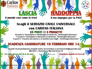 Sono disponibili 25 posti con Caritas Italiana per il Servizio Civile Universale. Le domande andranno presentate on line entro giovedì 10 febbraio alle ore 14. Gli incontri di presentazione online sono fissati per martedì 1, giovedì 3 e martedì febbraio ore 16.00. Per iscriversi agli incontri e per ulteriori informazioni inviare una mail a: serviziocivile@cascolto.org