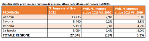 A livello locale, la provincia più ricca di imprese attive nel settore delle costruzioni è Genova (13.735), in crescita del +2,9% rispetto al 2020 e del +3,3% sul 2019. Seguono poi Savona (5.440, +2,2% sul 2020, +2,8% sul 2019), Imperia (5.119, +3,3% sul 2020, +4,7% sul 2019) e La Spezia (3.054, +2,4% sul 2020, +2% sul 2019).