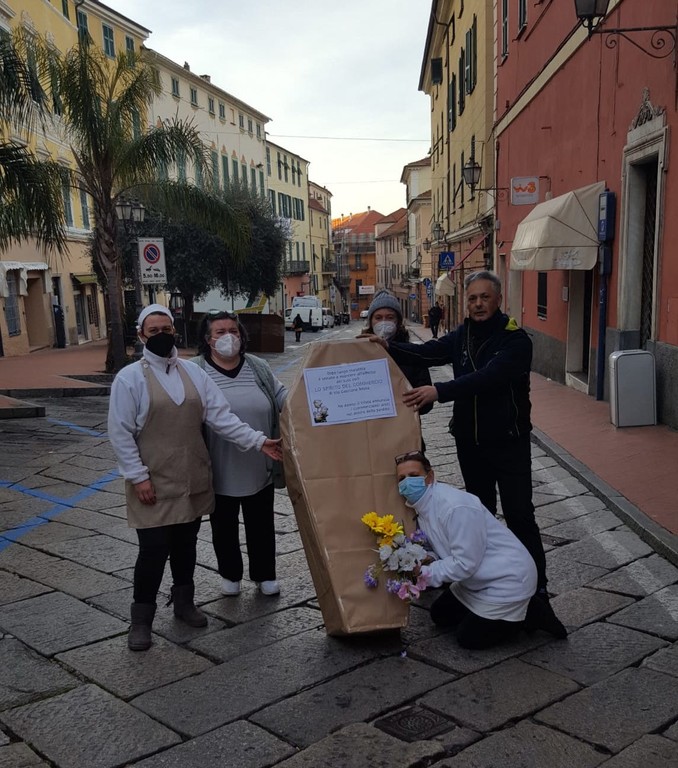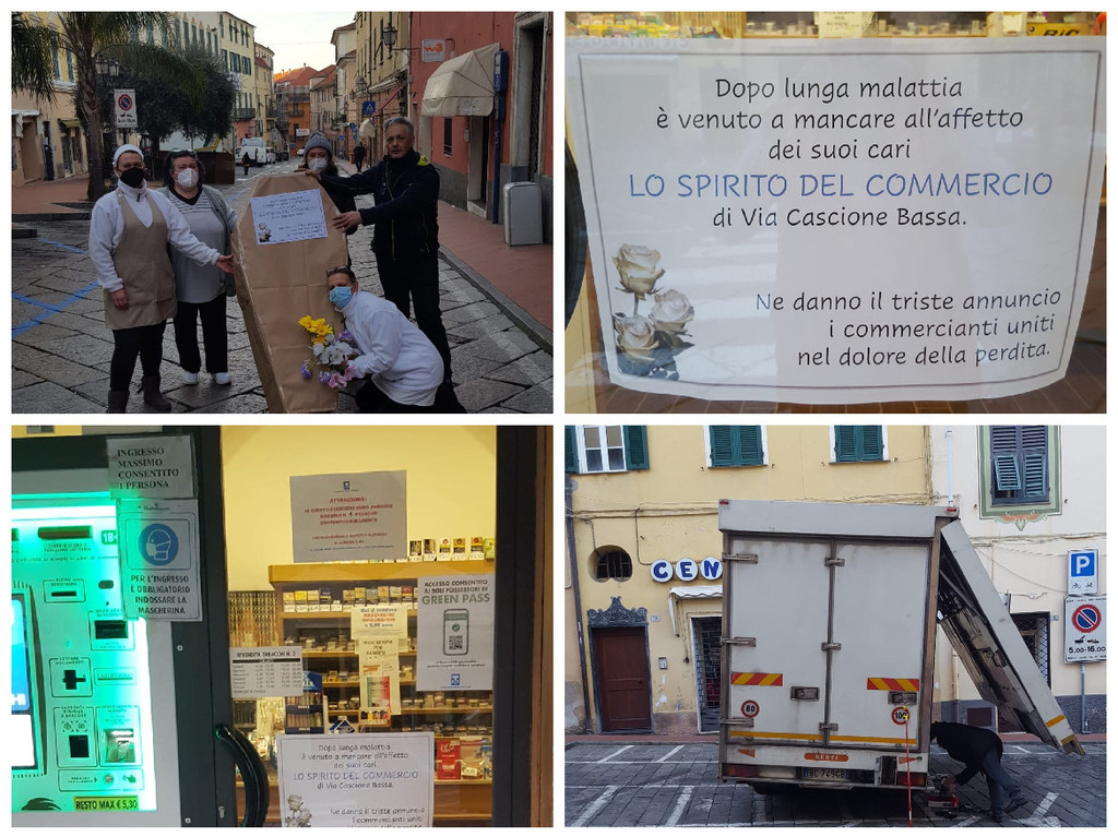 Imperia, mercato fantasma di Porto Maurizio: operatori e ambulanti uniti nella protesta ora inscenano il ‘funerale’ del commercio (foto)