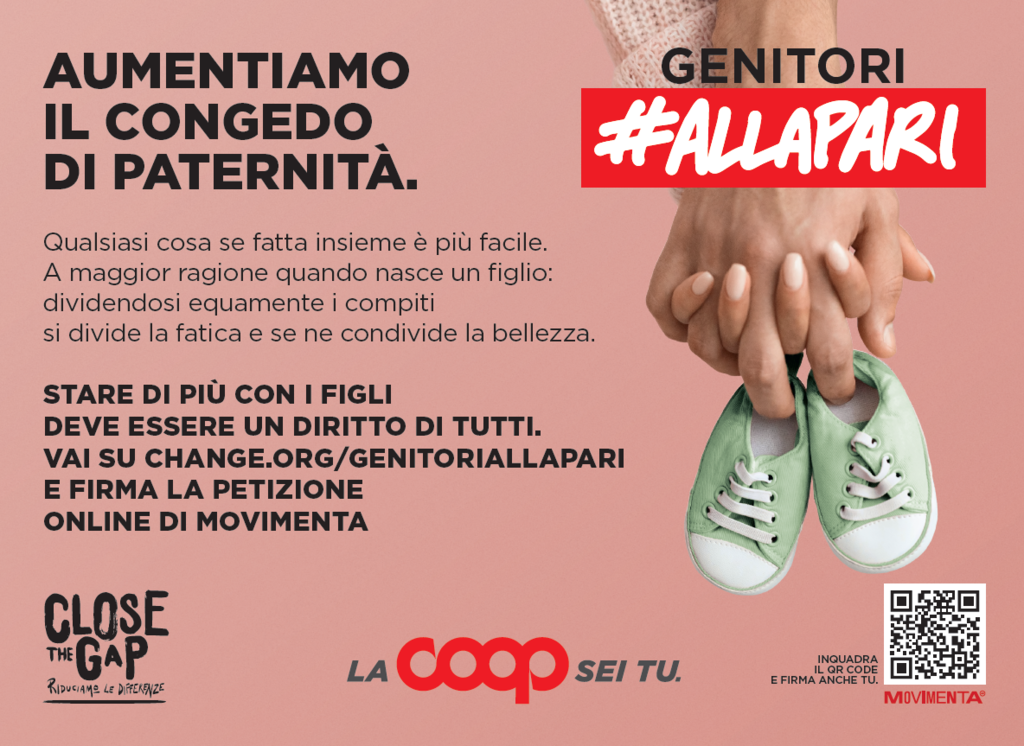 Nell’ambito di questa nuova fase della campagna, Coop sosterrà la petizione promossa dall’associazione Movimenta sulla piattaforma Change.org per aumentare i giorni di congedo parentale – attualmente solo 10 – previsti per i padri in occasione della nascita di un figlio.