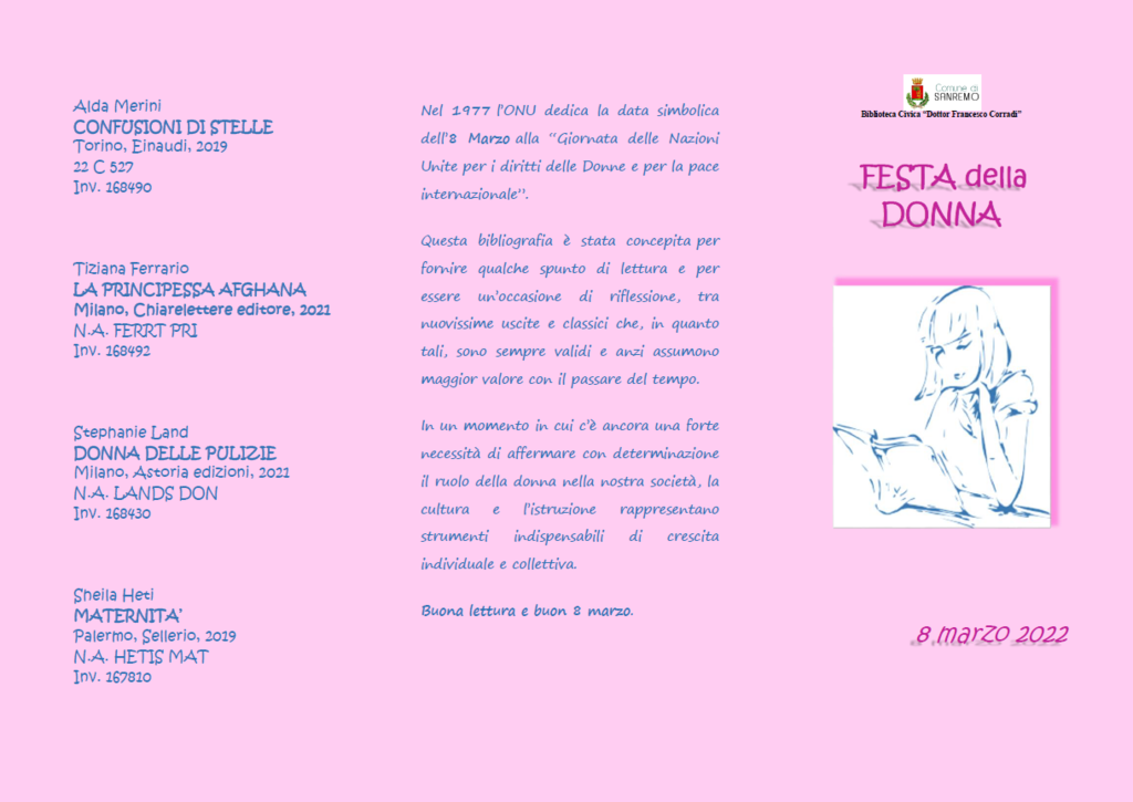 In occasione della “Giornata Internazionale della Donna” (8 marzo), la biblioteca civica propone una scelta di volumi a tema: novità e classici ritenuti importanti per una riflessione sulla condizione femminile, in un momento storico in cui le disuguaglianze di genere purtroppo sono ancora presenti nelle società occidentali (brochure allegata). I volumi proposti sono tutti ammessi al prestito.