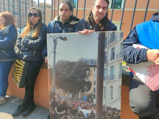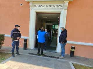 Sit in di fronte al Tribunale a Imperia di alcuni esponenti dei movimenti 'Rivoluzione etica' e no green pass che hanno depositato una denuncia nei confronti del Prefetto e del Questore della provincia.