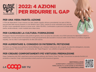 Coop Liguria su questo tema è già all’avanguardia perché, nell’ambito delle tante azioni di welfare volte a sostenere i lavoratori nella conciliazione di vita professionale e familiare, garantisce al personale un settimo mese facoltativo di congedo, retribuito al 30%, fruibile sia dalle neomamme, sia dai neo-papà, qualora siano loro a scegliere di restare a casa al posto delle compagne. Per questa opportunità e per tutte le altre politiche di sostegno alla genitorialità, la Cooperativa è stata premiata dall’INAIL e dalla Consigliera di Parità della Regione Liguria.