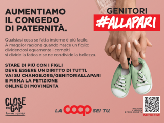 Nell’ambito di questa nuova fase della campagna, Coop sosterrà la petizione promossa dall’associazione Movimenta sulla piattaforma Change.org per aumentare i giorni di congedo parentale – attualmente solo 10 – previsti per i padri in occasione della nascita di un figlio.