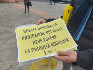 "Siamo qua questa sera per manifestare il nostro dissenso contro le violazioni dei diritti umani, ha dichiarato Francesca Bisiani, responsabile di Amnesty international per la Liguria, che stanno avvenendo in Ucraina. Le forze armate russe hanno commesso diversi crimini di guerra che violano la convenzione di Ginevra e i documenti internazionali in tema di conflitti armati a danni dei civili, l'uso di missili balistici, di bombole a grappolo che sono vietate dal diritto internazionale e invece sono stati usate sugli asili nido uccidendo bambini, minorenni, civili anche in strada e all'interno degli ospedali e scuole. Chiediamo che tutto questa finisca immediatamente e che anche in un contesto come questo vengano rispettati i diritti fondamentali, compresa la tutela dei prigionieri arrestati durante il conflitto armati".
