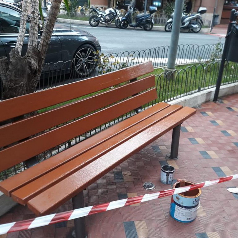 Manutenzione di panchine e fontane pubbliche in centro a Ventimiglia, dove è stato anche ripulito e dipinto il piccolo ponte all'interno dei giardini Tommaso Reggio.