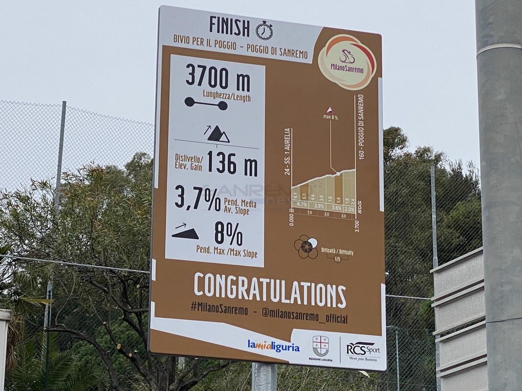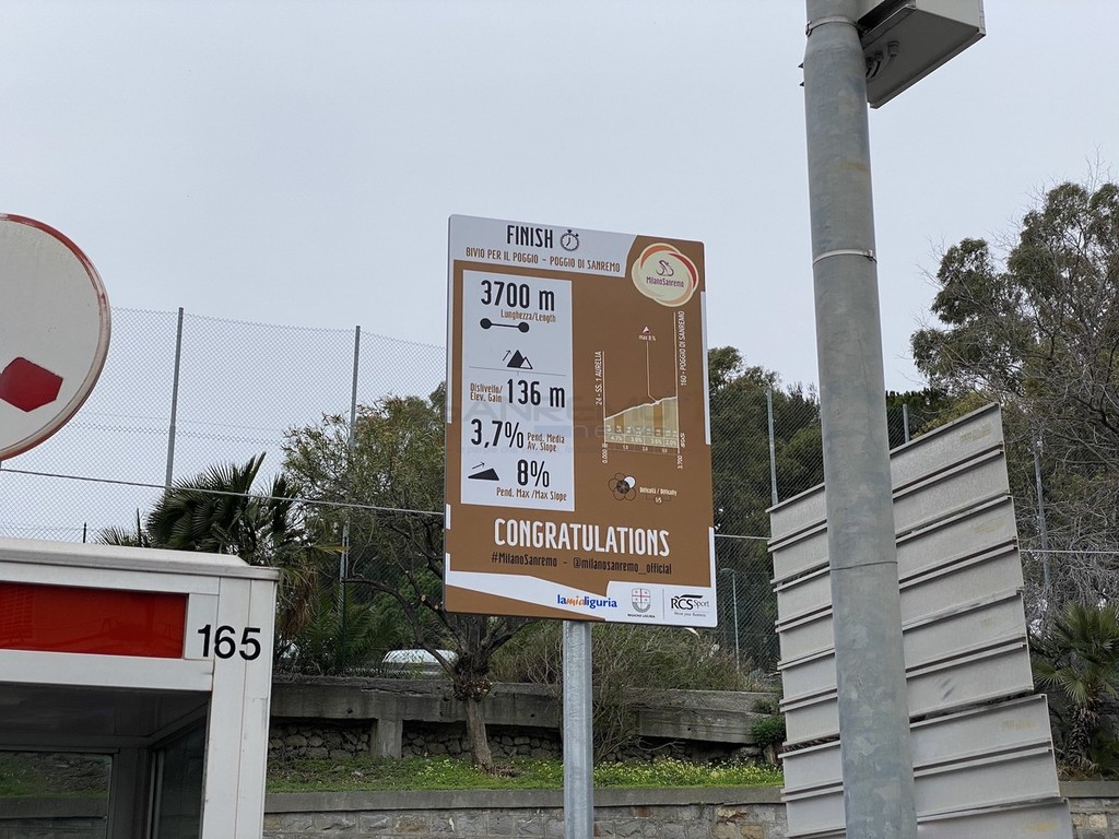 Nei cinque punti simbolo della Classica Monumento, il Poggio, Cipressa e i tre capi (Mele, Cervo e Berta) sono stati allestiti dei cartelli segnaletici, di colore marrone come quella riservata a punti di interesse storico, artistico, culturale e turistico.