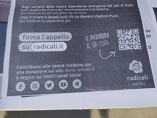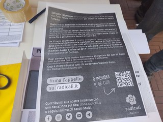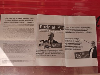 Avviata stamani a Imperia, in via San Giovanni, la raccolta firme dei Radicali italiani affinché il leader russo, Vladimir Putin, sia incriminato davanti alla Corte Penale Internazionale dell’Aja per l’aggressione all’Ucraina. La petizione inoltre, mira all’entrata in Unione Europa dell’Ucraina in modo che il paese possa godere di ulteriori misure di protezione internazionale. L'iniziativa si svolgerà sino alle 19 di oggi e domani mattina dalle 10.30 alle 19.