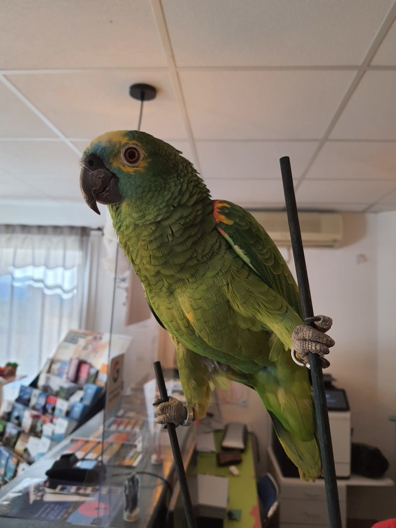 Ieri sera in tarda serata in zona Borgo a Sanrmeo nei pressi del bar Dei Fiori è scappato per uno spavento un pappagallo Amazone verde fronte blu che si chiama ÉMERAUDE