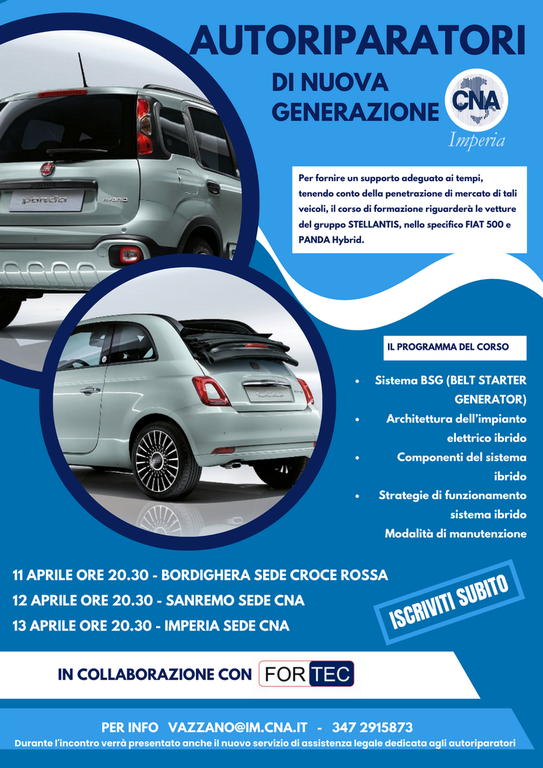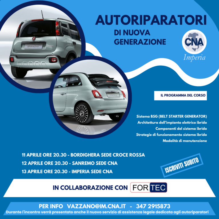 Al via “Autoriparatori di nuova generazione”, il nuovo corso di formazione ed aggiornamento dedicato al mondo dell’autoriparazione targato CNA Imperia e Fortec, da anni partner esclusivo della formazione nel settore automotive. Tre serate in tre sedi diverse, Bordighera, Sanremo e Imperia, per approfondire le tematiche legate alla gestione dei veicoli ibridi ed elettrici: non solo teoria, ma anche attività pratiche, per capire come meglio muoversi in questa nuova frontiera dell’automotive.