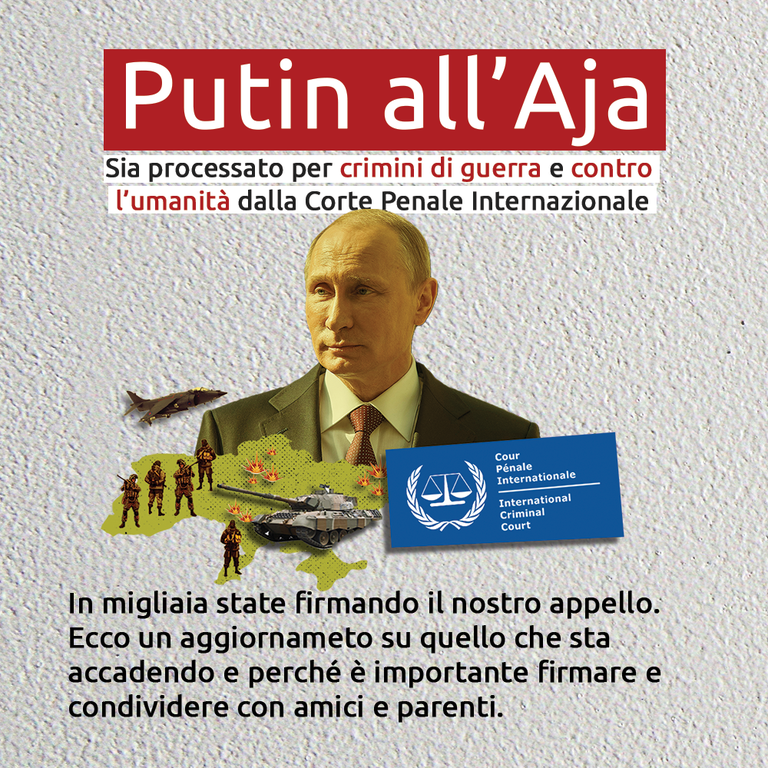 «La raccolta firme – spiegano i Radicali - ha anche un obiettivo di conoscenza: 1) Putin all’Aja: perché l’aggressore russo sia incriminato davanti alla Corte Penale Internazionale; l’altra Corte, quella di Giustizia dell’Onu, sempre con sede all’Aja, ha già condannato l’aggressione russa all’Ucraina; 2) Ucraina in Europa Subito: affinché l’Ucraina entri nell’Unione Europea con procedura accelerata, in quanto invasa da una superpotenza nucleare nord asiatica.