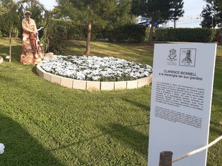 La grande sagoma di Clarence Bicknell in bicicletta, mezzo con cui percorreva la Riviera e l’entroterra tra Sanremo e Ventimiglia sino a Tenda alla ricerca di specie botaniche endemiche della zona, accoglie i visitatori all’inizio del percorso di Euroflora, davanti alle grandi fontane scenografiche, nell’aiuola dominata dalla grande facciona di Grock, a simboleggiare due tipi diversi di giardini che caratterizzano l’estrema Liguria: il “giardino naturalistico” voluto da Clarence Bicknell attorno al suo Museo di Bordighera e il “giardino di pietra” realizzato dal clown svizzero davanti alla Villa di Imperia.